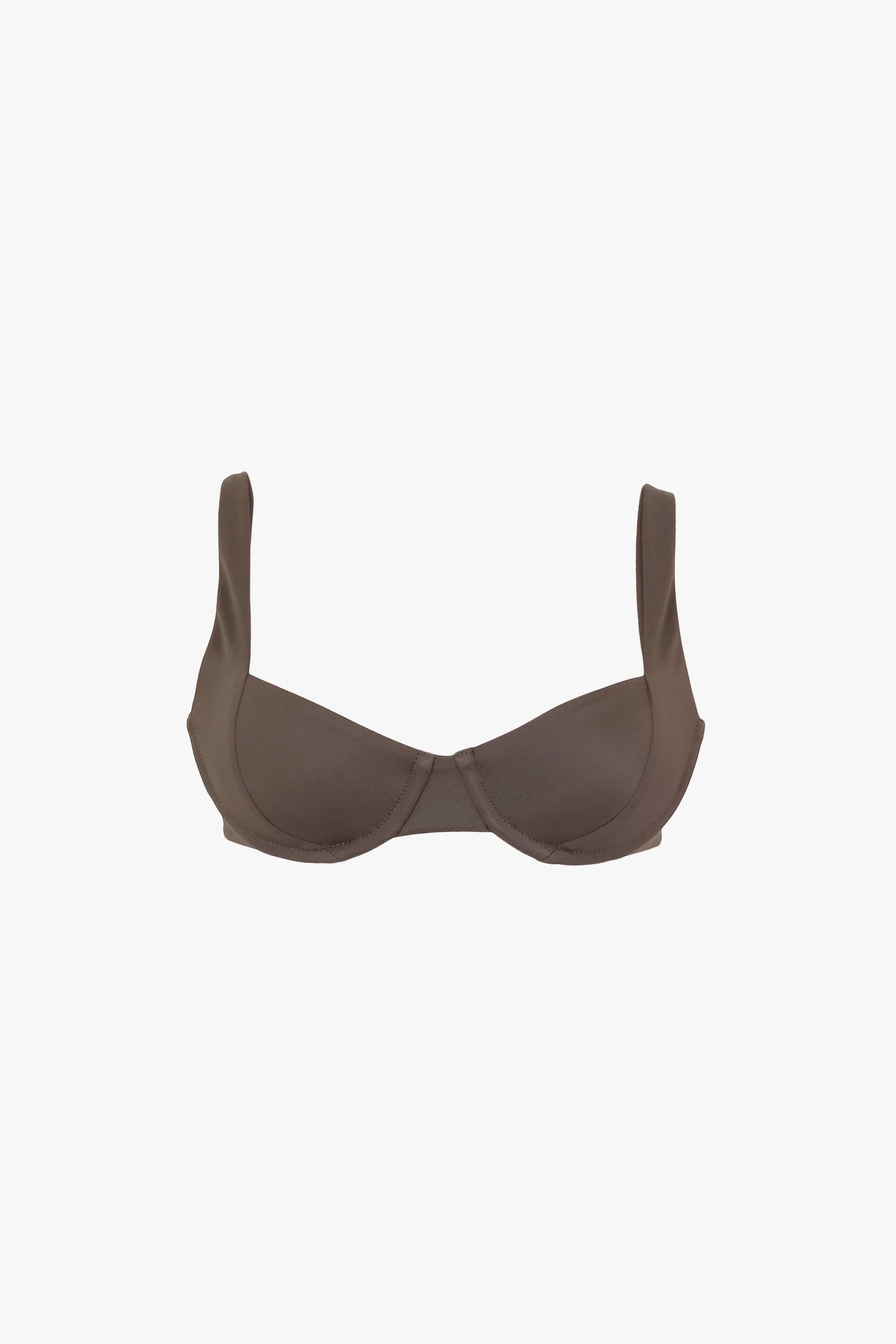La Gabrielle Top in Chocolat de Borneo Paris est un haut de bikini balconnet à armatures doté d'un décolleté romantique emblématique avec des bretelles plus épaisses.